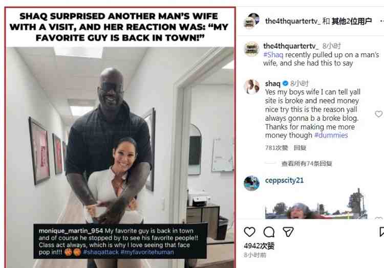12月8日讯 近日一位有夫之妇Monique Martin在社媒晒出一张图片,其中她和奥尼尔热情相拥。