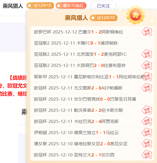 【战绩回顾】王牌日乙13胜10!昨日继续大捷,豪取12胜10,重点亚冠2北京国安中比分,大阪钢巴中比分,欧罗巴胜比分!今日比赛质量佳!乘胜追击,信心强烈,全力分析,只王牌精研有把握的比赛,继续拿下,加油冲全胜!欢迎长期关注猎人。